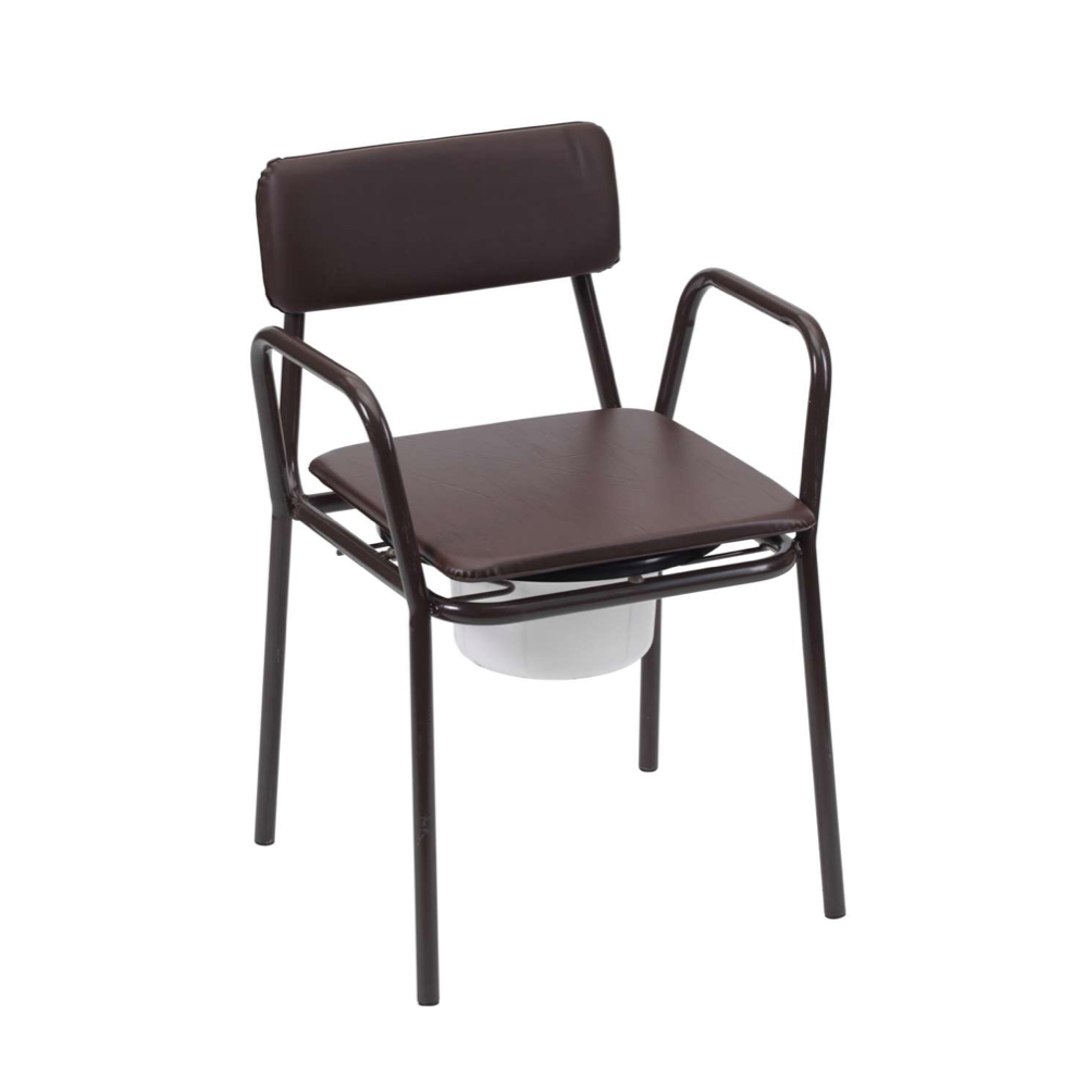 The Stacking Commode range is made from high quality steel tubing, with a tough brown coating for durability. The commode can be used anywhere in the home. The range comes with a cushioned overseat and back for comfort, covered in flame-retardant, heat-sealed vinyl, which is water resistant and easy to clean. Under the padded seat is a hinged toilet seat which gives access to an easily removable bucket with lid. Fixed height, Adjustable height and removable armrest models are available.
